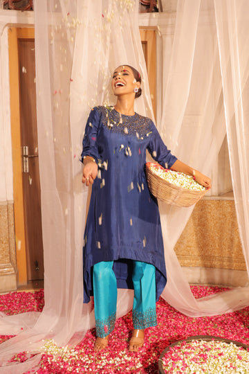 Description: This exquisite silk kurta pants set features a beautifully crafted kurta with hand-embroidered 3/4...