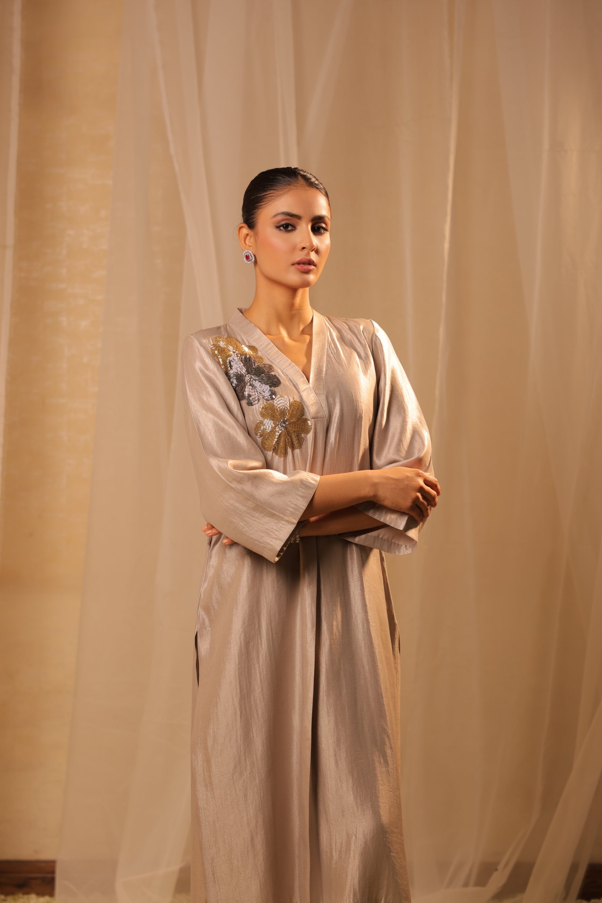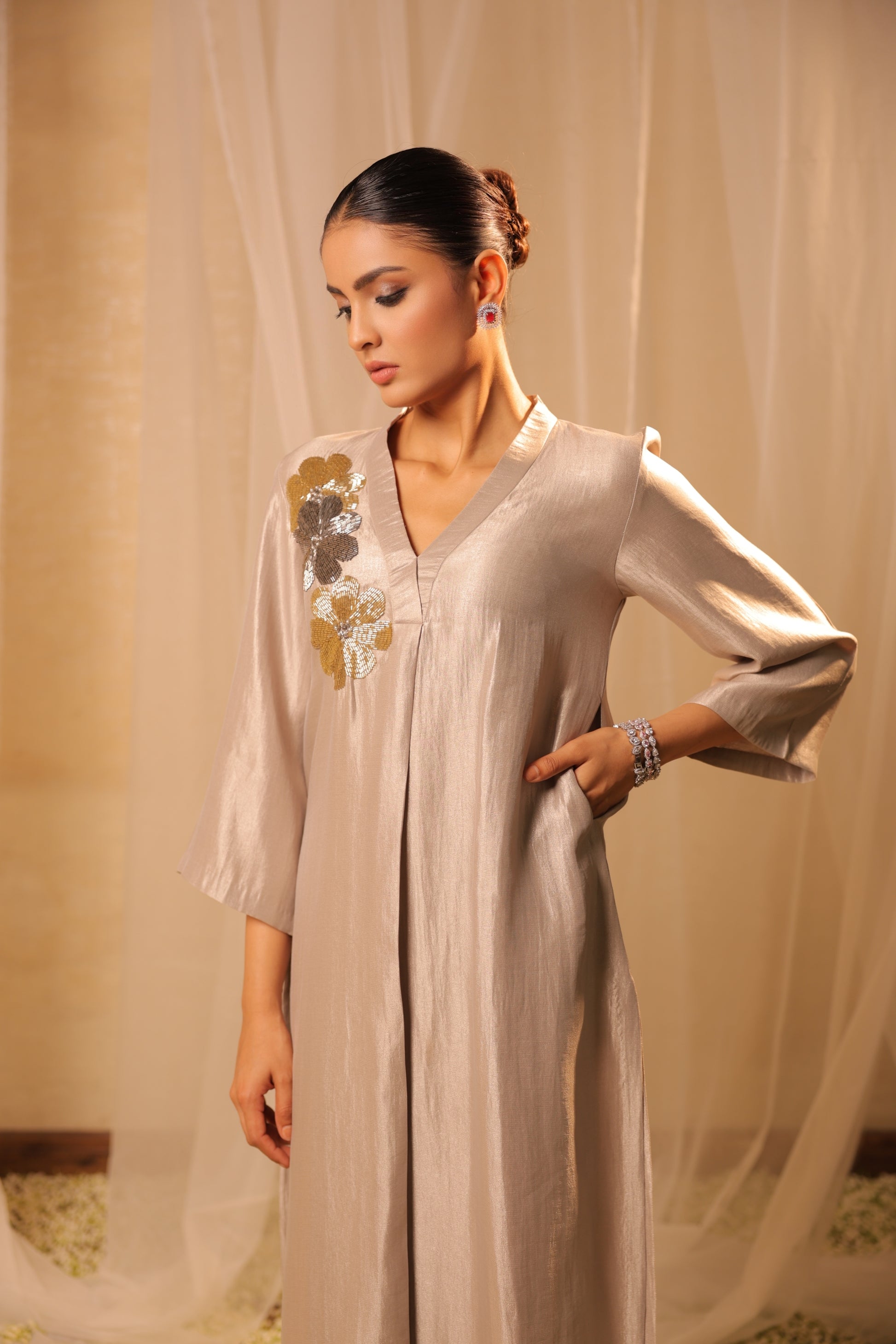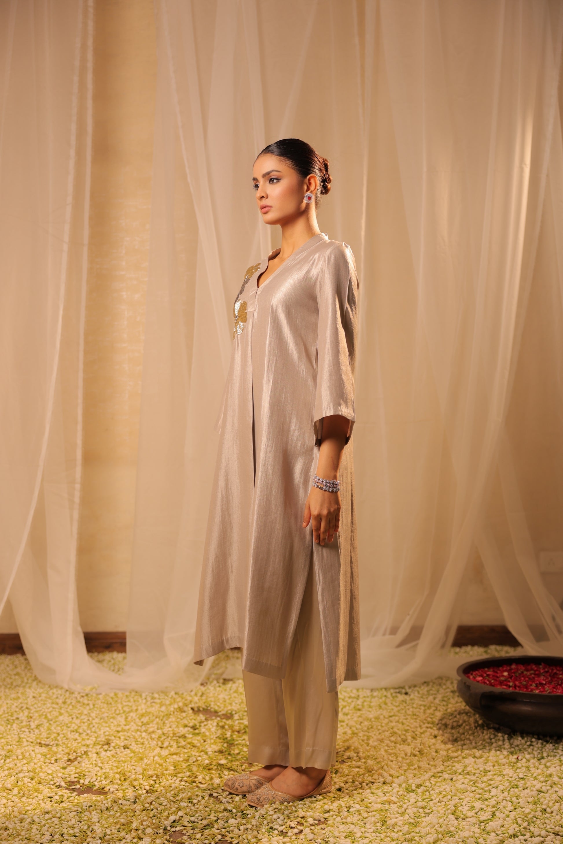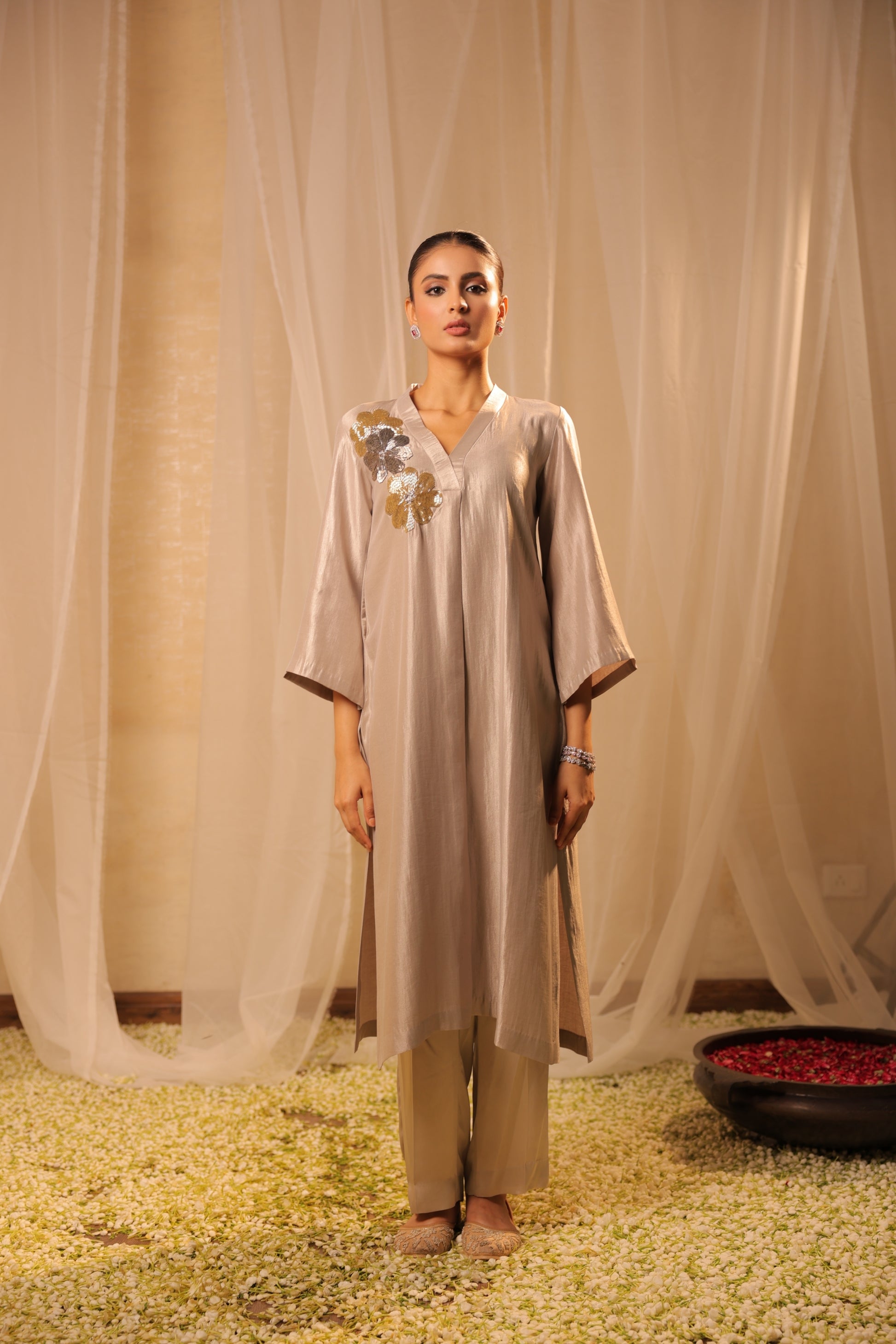 Elegant Beige Organic Shimmer Kurta with Hand Embroidered Motifs and Plazo